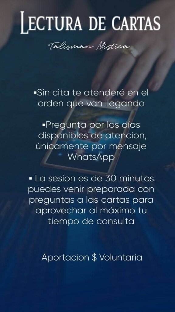 - La sesión es de 30 minutos. Puedes venir preparada con preguntas a las cartas para aprovechar al máximo tu tiempo de consulta.